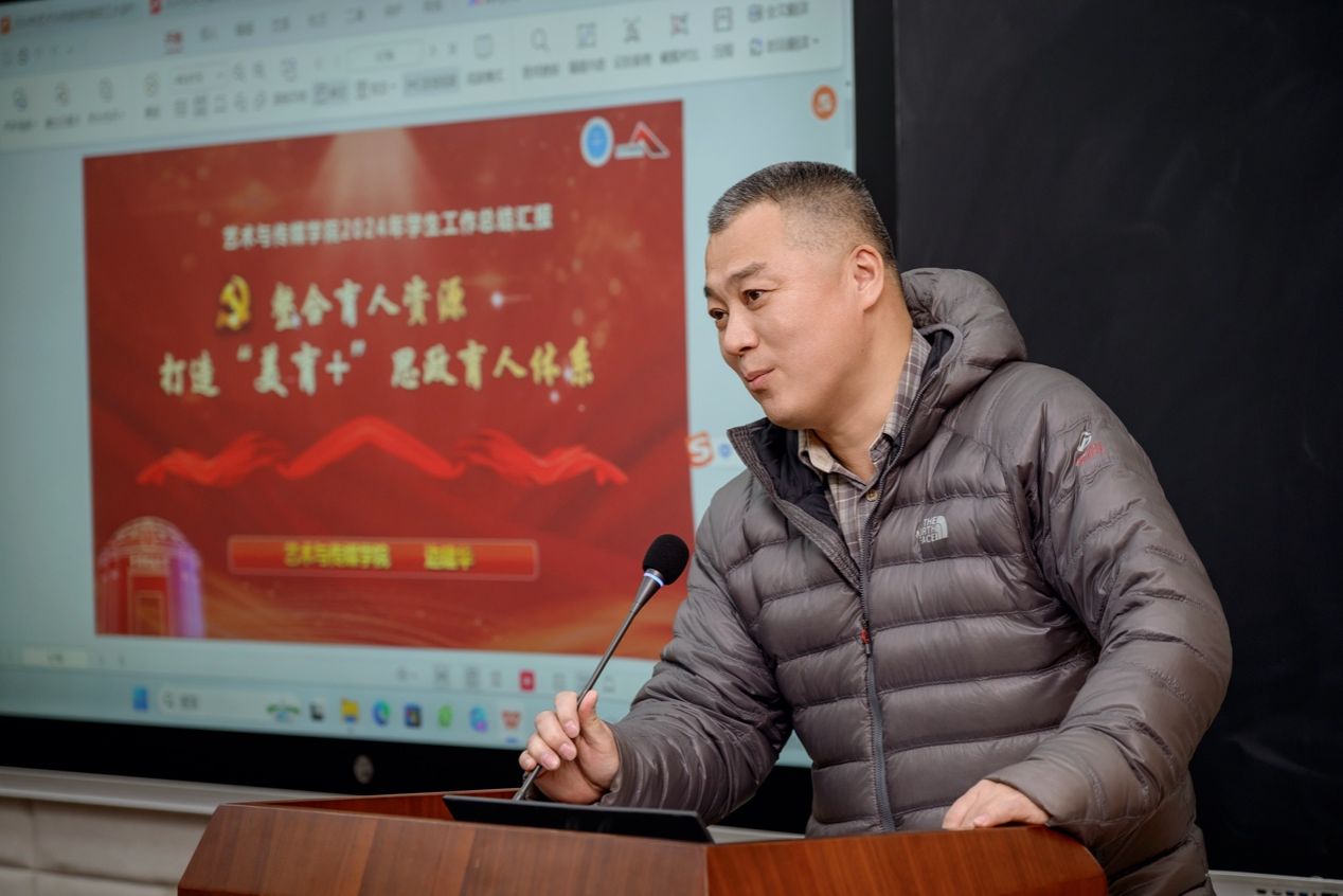 王甫总结讲话。他对学院2025年度的工作成效予以充分肯定,他表示,过去一年,学院领导班子敢于直面问题、勇于担当尽责,聚焦立德树人这一主责主业,积极推动学院高质量发展,党建思政工作特色凸显,导学团队建设成效显著,美育和社会实践工作亮点纷呈。针对做好学院下一阶段工作,他指出:一是要将学院发展融入高等教育发展的整体布局,与学校事业发展同频共振;二是要始终把打造立德树人新格局作为学院立院之本,每位教师都应在提升教书育人质量方面积极贡献自身力量;三是要紧盯设计学交叉学科博士点申报工作,为学院发展筑牢根基;四是要深化改革,不断探索学院转型发展新路径,充分激发干事创业活力,积极营造学院发展的良好态势。