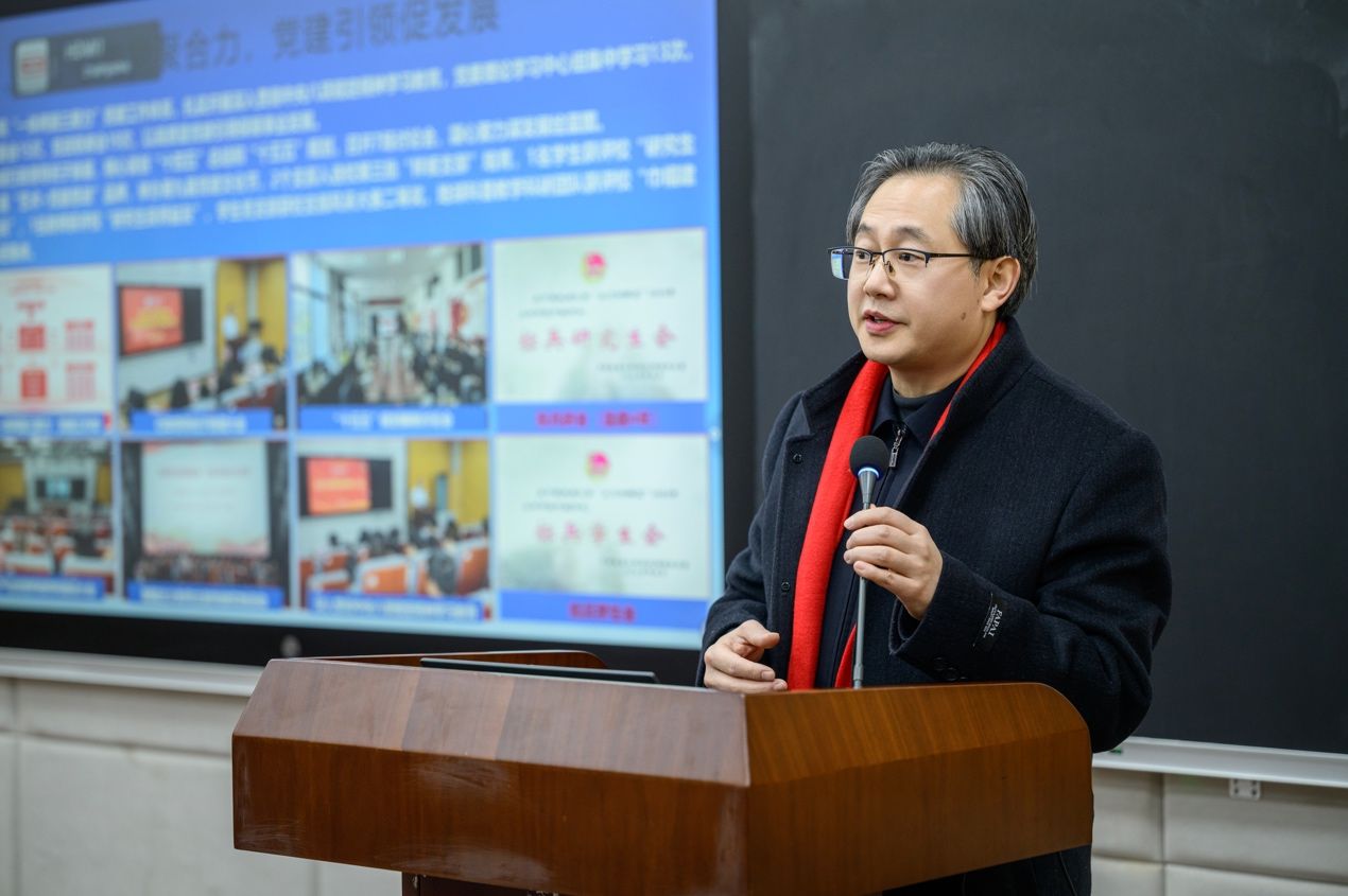 院长何清俊作学院2025年度工作报告。他从党建思政、学科建设、人才培养、科学研究与社会服务、美育建设等多个维度,详细报告了学院2025年的工作进展。他指出,2026年学院将以申报博士点为引领,以提高人才培养质量为核心,以深化特色交叉学科发展为路径,全力开创学院事业发展新局面。